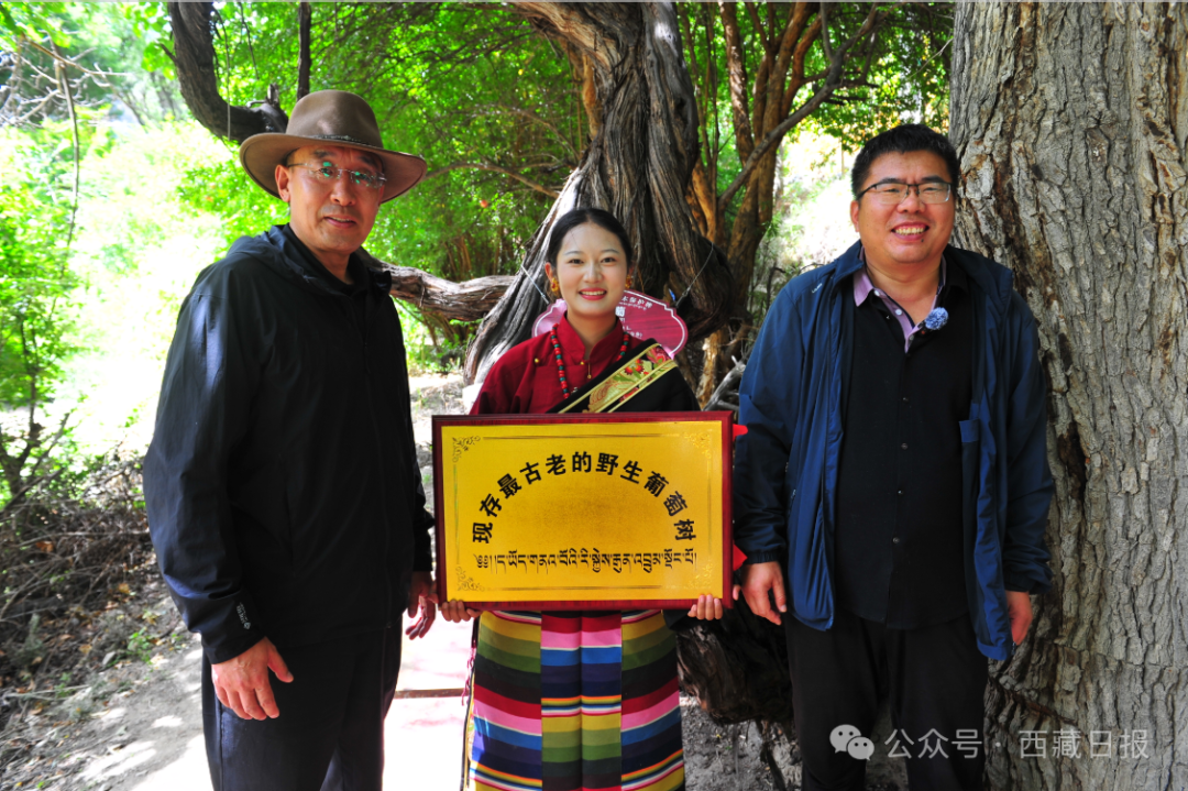 图为中国农业科学院果树研究所副所长、国家葡萄产业技术体系首席科学家王海波(右)与昌都市政协副主席泽仁罗布共同为古葡萄树授牌。记者 温凯 平措郎加 摄